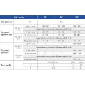 UV-C Clarifier is fully submersible (IP68). It can be immersed directly in the pond or aquarium sump. Has a safety switch that automatically deactivates the UV-C lamp during maintenance. Its compact sizes make it suitable for use in aquariums, turtle tanks and ponds.